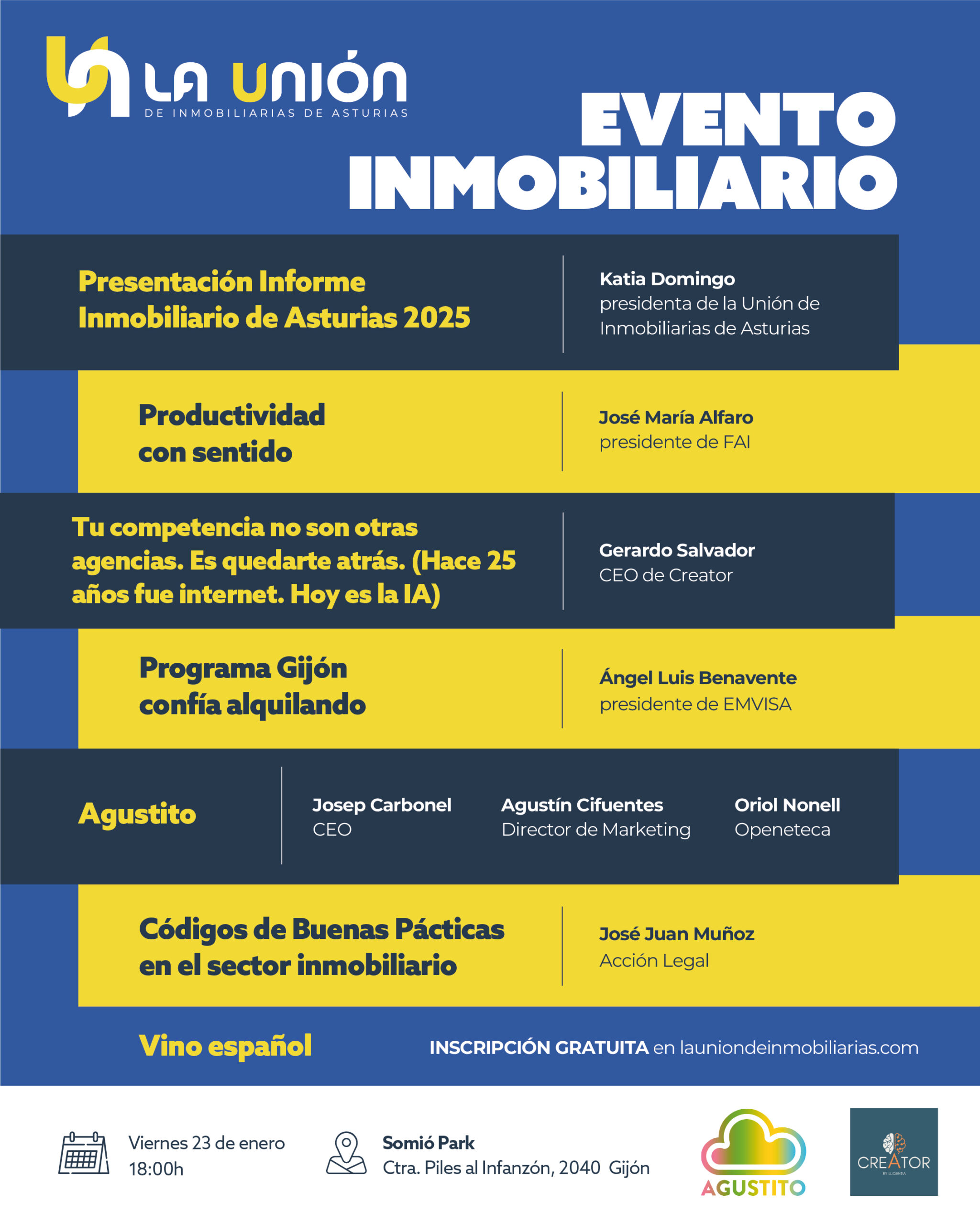 LA UNIÓN DE INMOBILIARIAS DE ASTURIAS celebra su evento anual en el Restaurante Somió Park de Gijón (Ctra. Piles al Infanzón 2040) el próximo viernes 23 de enero a las 18:00h. Tendremos ponencias inmobiliarias, encuentro de profesionales, se presentará el Informe Inmobiliario de Asturias 2025 y se entregarán los premios ASOCIAS 2025.